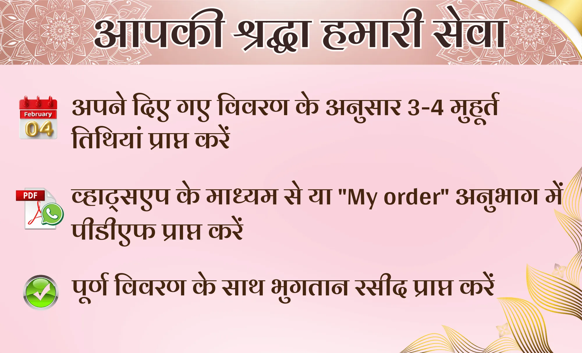 अपना मुहूर्त प्राप्त करें: 48-72 घंटों के भीतर, आपको पीडीएफ प्रारूप में एक विस्तृत मुहूर्त प्राप्त होगा, जो सीधे आपके व्हाट्सएप, ईमेल या अन्य पसंदीदा चैनलों पर भेजा जाएगा।