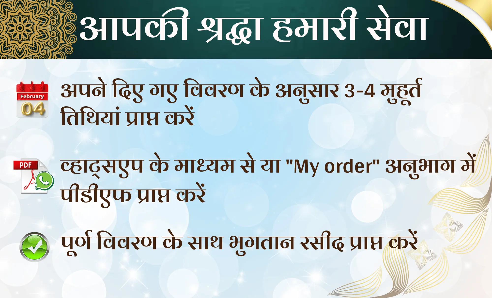 अपना मुहूर्त प्राप्त करें: 48-72 घंटों के भीतर, आपको पीडीएफ प्रारूप में एक विस्तृत मुहूर्त प्राप्त होगा, जो सीधे आपके व्हाट्सएप, ईमेल या अन्य पसंदीदा चैनलों पर भेजा जाएगा।
