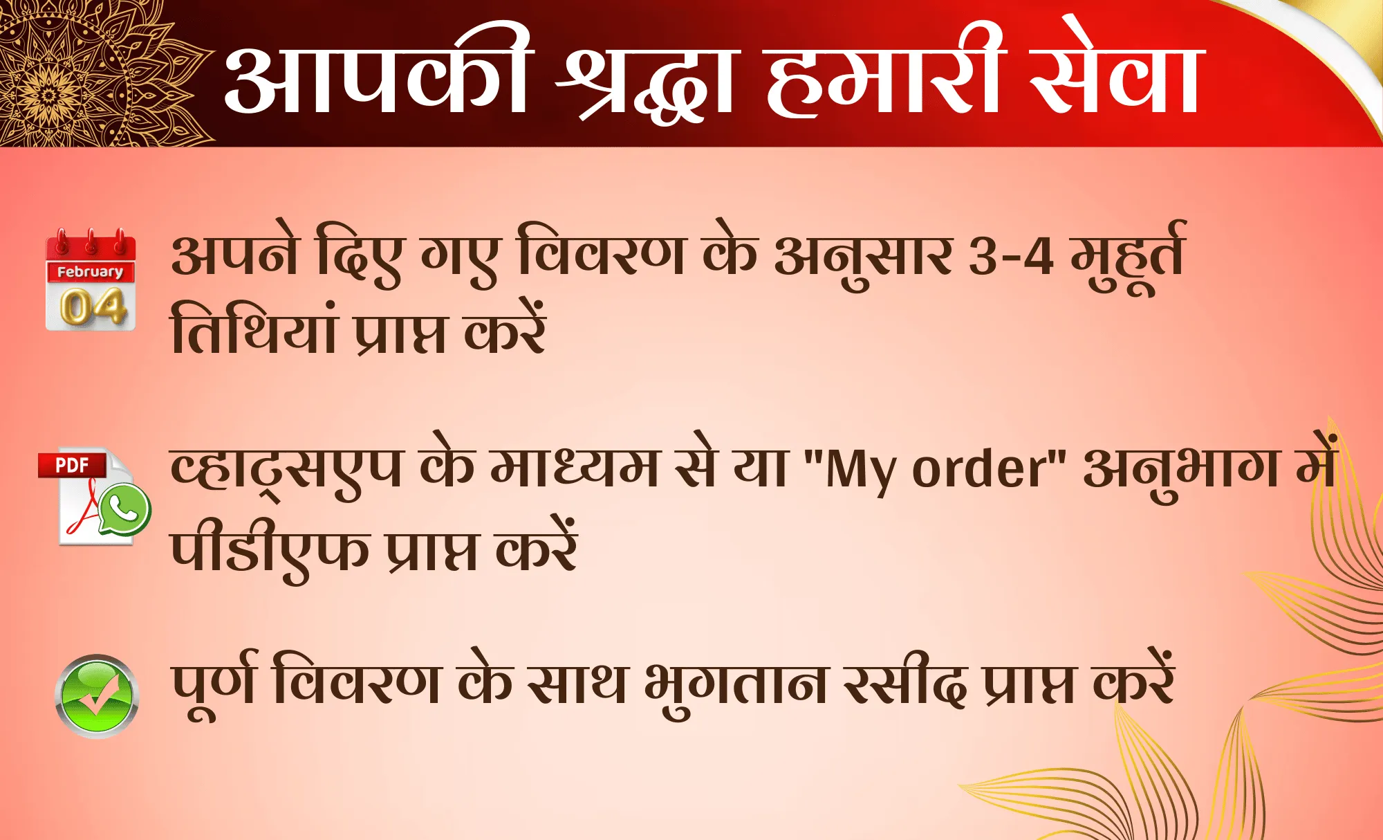 इस सेवा के तहत, आपको शुभ दिनांक, तिथि, वार, नक्षत्र, और समय की जानकारी उपलब्ध कराई जाएगी, ताकि आपका विवाह शुभ मुहूर्त में संपन्न हो सके।