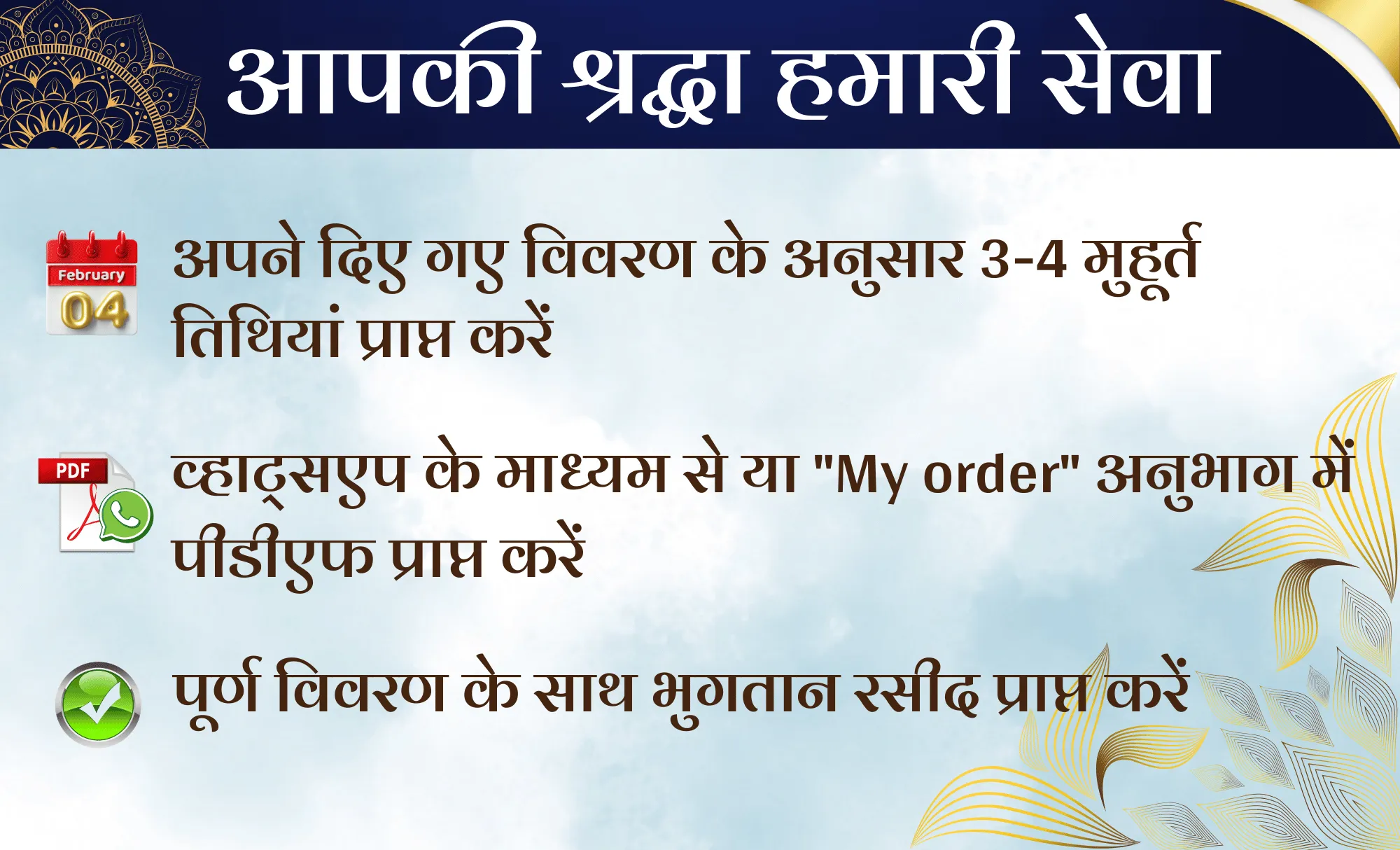 इस सेवा के तहत, आपको शुभ दिनांक, तिथि, वार, नक्षत्र, और समय की जानकारी उपलब्ध कराई जाएगी, ताकि आपके बच्चे का मुंडन शुभ मुहूर्त में संपन्न हो सके।