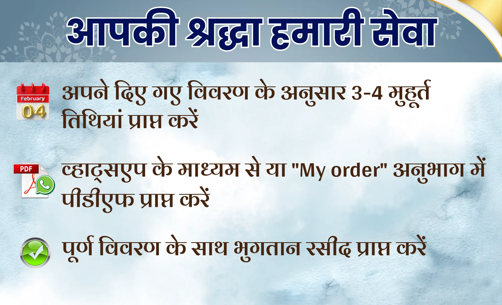 इस सेवा के तहत, आपको शुभ दिनांक, तिथि, वार, नक्षत्र, और समय की जानकारी उपलब्ध कराई जाएगी, ताकि आप अपने नए वाहन की खरीदी को शुभ मुहूर्त में कर सकें।